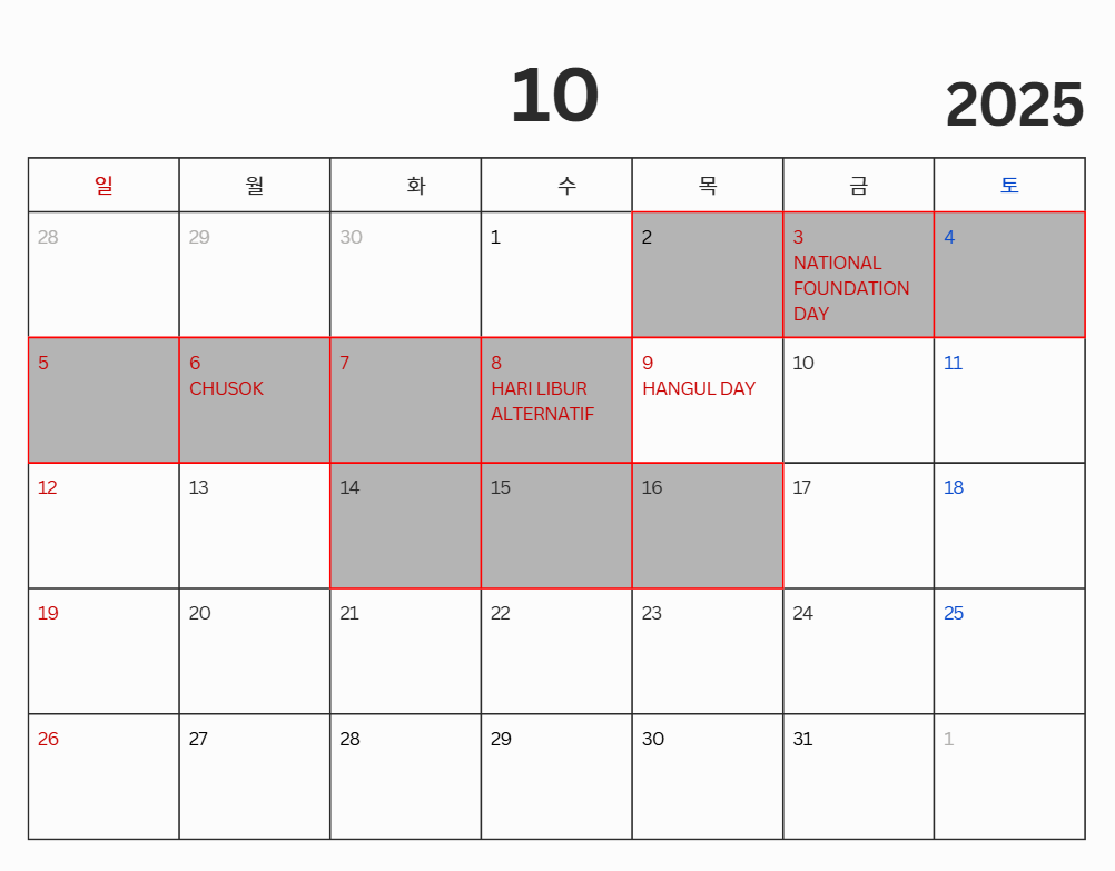 Tgl 2 ~ 8 Oct. dan tgl 14 ~ 16 Oct. 2025 tidak ada pengiriman tekbe karena liburan Chusok.